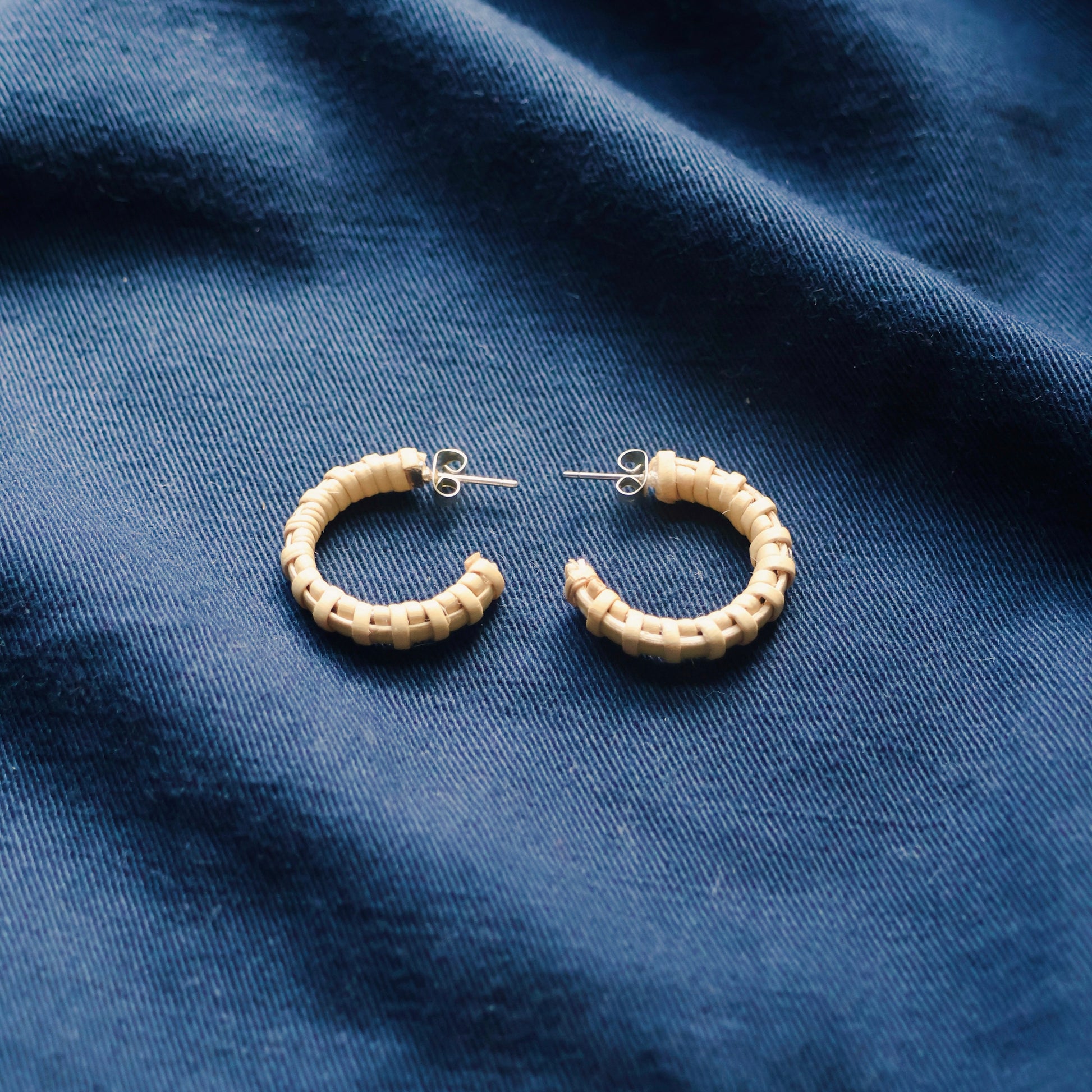 These lightweight, 25mm tiny hoops are a great addition to any outfit. The earring hoop is woven with natural weavers around natural staves, and varnished to seal and protect.